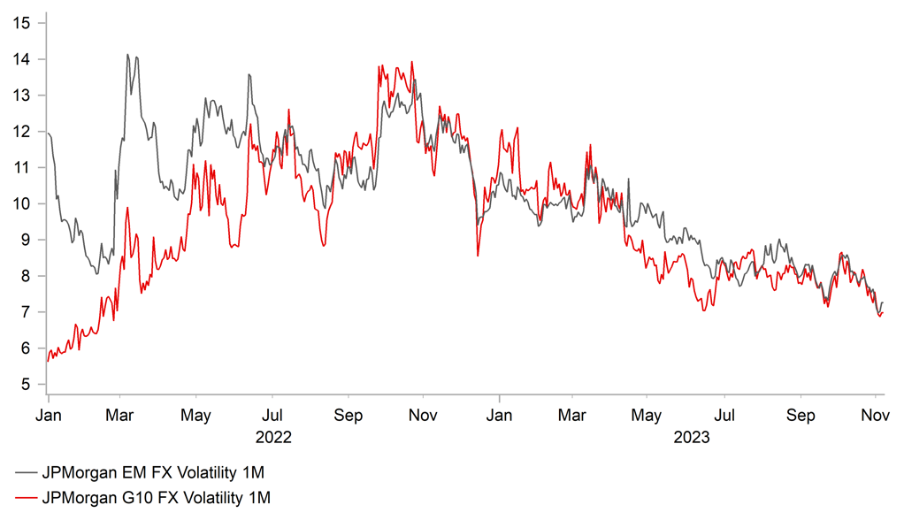 The reduction in US yields is initially positive for EM FX and triggered a broad-based improvement in global investor risk sentiment reflecting relief that major central banks including the Fed have likely finished raising rates. It has also resulted in foreign exchange market volatility falling to fresh year to date lows both for developed and emerging market currencies. The ongoing decline in volatility and improvement in global investor risk sentiment has provided a fresh shot in the arm for popular EM FX carry trades such as the MXN. However with the Fed at the end of their rate hike cycle, it should create more leeway for emerging market central banks to keep lowering rates resulting in a further narrowing of yield differentials. USD/BRL dropped back below the 5.0000-level last week even as the BCB lowered the policy rate by a further 0.50 point to 12.25%. In EMEA, the NBP meets in the week ahead and is expected to stick to a slower pace of cuts (0.25 point) after the unfavourable market reaction to the larger cut delivered in September. The main downside risk for EM currencies would be if fears over a sharper US/ global slowdown intensified. Please see our latest EM EMEA weekly for more details (click here).