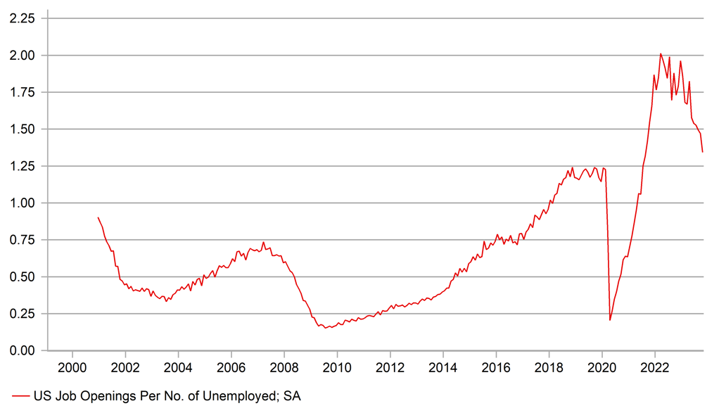 NORMALISING US LABOUR MARKET AS JOB OPENINGS FALL BACK SHARPLY RELATIVE TO TOTAL UNEMPLOYED