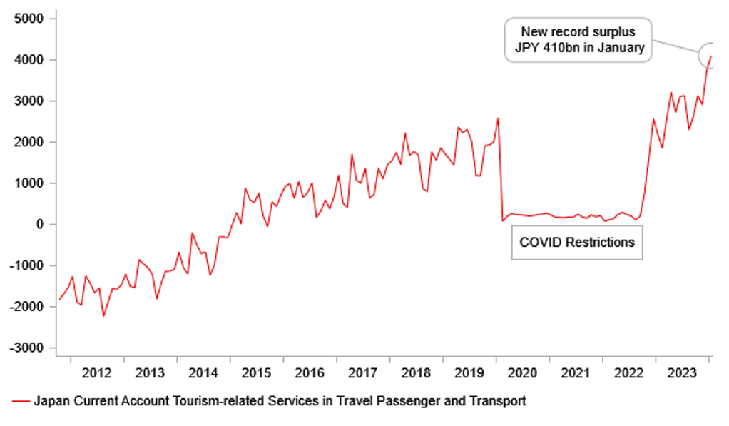 While the reversal of the energy price shock is important in this turnaround, the services trade component is being helped by surging tourism activity in Japan. Japan’s services trade in tourism-related services in travel passengers and transport has surged with yen weakness and government policy playing key roles. The surplus hit another new record of JPY 410bn in January. In 2023 the surplus totalled a record JPY 3,350bn – during covid it was close to zero but the 2023 total was also 53% larger than in 2019. Yield divergence is of course key for the yen but with that factor turning more favourable for the yen, Japan’s external position will certainly help reinforce yen strength.