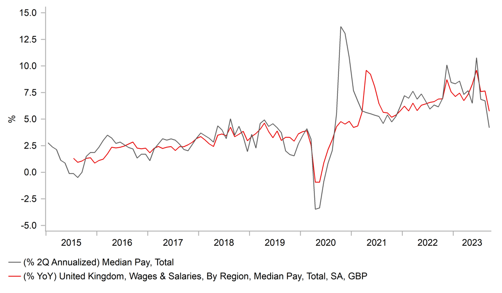 The economy is certainly much more resilient in the US than in the UK and the BoE must also be encouraged by the clear easing of demand for labour. The PAYE employment data shows three consecutive month-on-month declines in employment and this softening in the labour market is resulting in a slowdown in wage growth captured in the same PAYE data set. The annual growth rate in median pay slowed from 7.6% in August to 5.7% in September while the 6mth annualised growth rate slowed from 6.7% to 4.2% - the slowest pace since August 2020. Further evidence of wage growth slowdown like this will be crucial for this early sign of a shift in rhetoric being sustained. While the Pill comments this week have not resulted in any broader underperformance of GBP, the risks will remain to the downside for now. Governor Bailey speaks in Dublin at 09:30 today..