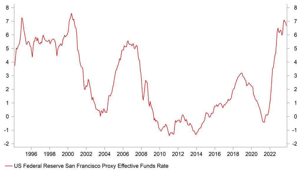 The major foreign exchange rates have stabilized overnight with EUR/USD trading just above the 1.0700-level and USD/JPY just below the 151.00-level. The main market move yesterday was the ongoing sell-off in the oil market where the price of Brent has fallen back below USD80/barrel. It has helped to drag market-based measures of inflation expectations lower. The US 10-year break-even rate has fallen from just below 2.50% on 19th October to around 2.35%. Over the same period the 10-year US Treasury yield has fallen by around 0.50 point from just over 5.00%, and is currently testing support at 4.50%. The initial rally for the price of oil triggered by the conflict between Hamas and Israel has proven to be short-lived, and provides more reassurance that inflation will continue to slow in the year ahead. It supports market expectations that the Fed is unlikely to raise rates further, and will begin to reverse rate hikes next year encouraged by slower inflation and growth. After the release of the much weaker non-farm payrolls report for October, the US rate market is more confident to price in again further rate cuts from the Fed by the end of next year. There are currently around 88bps of cuts priced by December 2024 which is almost exactly the same as what it expected from the ECB over the same period. In light of the recent resilience of the US economy relative to the euro-zone economy, US rate cut expectations appear relatively more aggressive than those for the ECB. The US economy would have to start slowing more notably in the coming quarters and/or inflation continue to fall more quickly than expected for the US rate market to price in even deeper rate cuts. It should help to prevent a sharper sell-off for the US dollar in the near-term. We are not yet convinced that the sharp US dollar sell-off at the end of last week will be sustained at least on a broad-based basis.