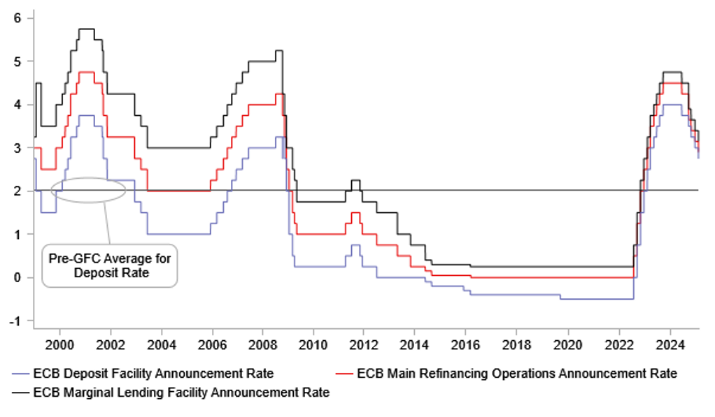 - As expected the ECB today cut the key policy rate by 25bps, taking the deposit rate to 2.75%.
