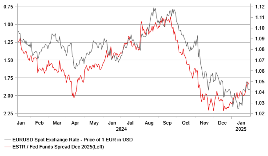 Hence, EUR/USD now again remains at the mercy of US trade tariff policy developments. One reason for speculative short EUR positioning is the anticipation that trade tariffs will be announced. That of course could come this weekend – the 1st February date for the 25% tariffs on Canada and Mexico and 10% on China remains live according to the White House and hence upside risks for the US dollar remain. Given the size of the euro-zone’s US trade deficit, expectations of tariffs in Europe will rise sharply if President Trump goes ahead with the tariffs over the weekend. For the US dollar this can still go either way. USD/CAD and USD/MXN moves point to continued scepticism on these tariffs being implemented given the US inflation impact. If Trump backs down another EUR/USD short squeeze will unfold, one that is likely to be larger than today’s squeeze on the outcome of the ECB meeting.