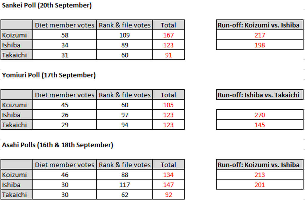 - The three leading candidates to become the next prime minister of Japan are Shinjiro Koizumi (45%), Shigeru Ishiba (35%) and Sanae Takaichi (20%)