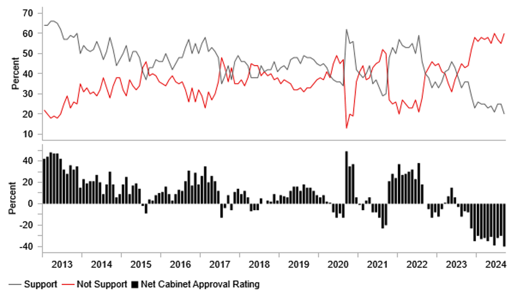 Prime Minister Fumio Kishida’s decision to resign as Prime Minister was driven by the negative fallout from the slush fund scandal that involved the misuse of campaign funds by members of the LDP. It has hurt the popularity of the ruling LDP government. According to polling by NHK (Japan Broadcasting Corporation) the net approval rating of the cabinet has recently fallen to a record low of -40% in the series dating back to 2013. 60% of respondents do not support the cabinet compared to only 20% who support the cabinet. The upcoming election provides the LDP with an opportunity to choose a new leader as they seek to distance themselves from the slush fund scandal. In this regard, the decision on who to choose as their new leader could be determined more by their current public popularity and having a clean image alongside pollical clout to build alliances within the LDP.
