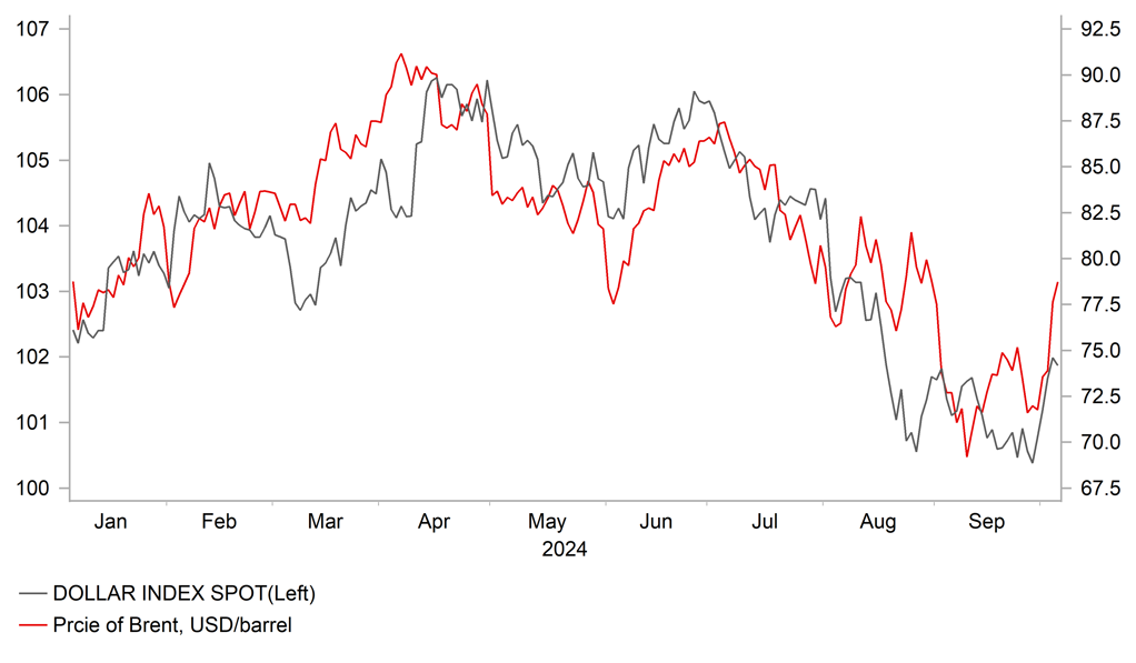 However, developments over the past week have highlighted why we remained cautious over forecasting further USD downside in our latest monthly FX Outlook report (click here). The flare up in tensions in the Middle East have helped to encourage a stronger USD. Market participants have moved to price in a higher geopolitical risk premium into the price of oil to reflect heightened concerns that oil supplies could be negatively impacted by the escalating conflict in the region. Investors remain on edge waiting to see how Israel retaliates to Iran’s missile strikes in the week ahead. The escalating conflict in the region poses upside risks for the USD through a number of potential channels including: i) safe haven demand, ii) a bigger negative terms of trade shock for Europe and Asia than for the US, iii) discouraging the Fed from speeding up the pace of rate cuts in the near-term by initially creating more concern over upside inflation risks, and iv) playing into the re-election campaign for former President Trump whose proposals for higher trade tariffs and looser fiscal policy are likely to prove supportive for the USD if implemented. Our base case scenario is that upside risks for the USD from heightened geopolitical tensions in the Middle East should ease but we are more concerned over the risk of a further significant escalation now (click here).