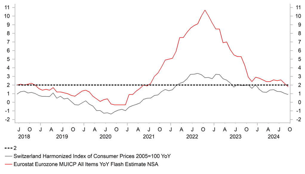 At the same time, the USD has derived support as well from the dovish repricing of monetary policy expectations for European central banks. Inflation data released in the euro-zone and Switzerland surprised significantly to the downside in September. Headline inflation in the euro-zone fell back the ECB’s target to 1.8% in September, and in Switzerland it fell even further below the SNB’s target to just 0.9% in September. The much weaker inflation readings has been quickly followed by dovish comments from ECB officials including President Lagarde and the normally hawkish Executive Board member Schnabel expressing more confidence that inflation is moving back in line with their target and providing a green light to speed up the pace of easing by delivering a back-back rate cut later this month. The euro-zone rate market has subsequently moved to fully price in 25bps rate cuts at the two remaining policy meetings this year, and every meeting during the 1H of next year which would lower the policy rate back towards more neutral levels closer to 2.00%. Another downside inflation surprise in Switzerland supports our view that the SNB should have delivered larger 50bps cut at last month’s policy meeting. Pressure continues to build on the SNB to keep cutting rates and/or intervene to weaken the CHF. The SNB will be concerned that a further significant escalation of tensions in the Middle East will encourage a sharply stronger CHF without intervention to dampen upside.