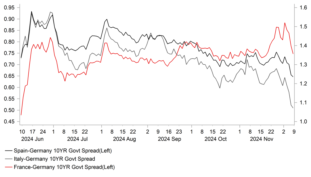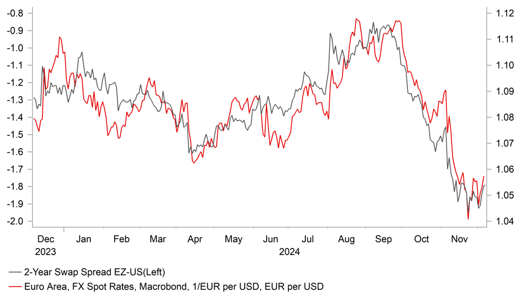 Overall the developments highlight that there is a higher hurdle now for the EUR to weaken further heading into year end. EUR/USD has already fallen sharply in the run up to and following the US election victory for Donald Trump, and market participants are now left waiting for a fresh trigger for another leg lower. Prior to the run into the US election EUR/USD was trading as high at the 1.1200-level but has since fallen by around 8 big figures in recent months. Without fresh catalysts, it is possible that stretched short EUR positions could be lightened heading into year-end. It would fit as well with the pattern of recent years when the EUR has tended to strengthen in December before reversing those gains at the next calendar year between January and March. Our quantitative analysis has found though that EUR outperformance in December is not a statistically significant seasonal pattern. Potential catalysts for a another leg for EUR/USD heading into year-end include: i) the ECB delivers or signals it is more open to delivering a larger 50bps cut, ii) the Fed skips cutting rates this month, and/or iii) President-elect Trump sends out another post on Truth Social threatening to impose higher tariffs on the EU. In light of these developments we have decided to take profit by closing our short EUR/USD trade idea, and will look for better levels to re-enter at the start of next year