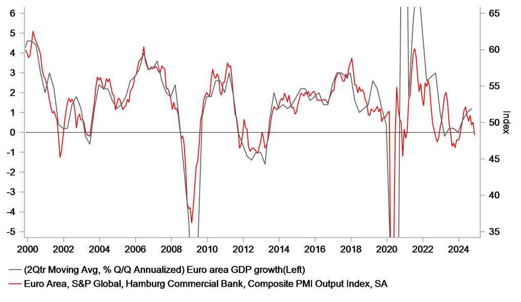 - The ECB are expected to lower rates further well by delivering another 25bps cut. Recent ECB communication has indicated that they want to lower the policy rate closer to 2.00% but there has been no strong signal that a larger 50bps cut is likely to be delivered as soon as next week. The euro-zone rate market is priced for a 25bps cut next week but is attaching a higher probability of a larger 50bps cut in Q1. Market participants will be waiting to see if the ECB provides any encouragement over the possibility of larger rate cuts next year. Downside risks to growth in the euro-zone from the threat of US trade tariffs and political uncertainty in France will garner more attention in the press conference.
