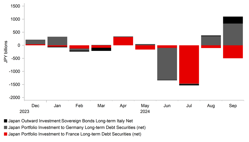 The ECB is currently in the process of scaling back support for euro-zone government bond markets as it continues to implement passive quantitative tightening. The APP portfolio is declining at a measured and predictable pace as the Eurosystem no longer reinvests the principle payments from maturing securities. Similarly, the ECB has clearly indicated that it will soon discontinue reinvestments under PEPP before the end of this year. Even though yield spreads between France and Germany have widened back out to their highest levels since the euro-zone debt crisis in 2012, we are not expecting the ECB to announce any measures to provide more support for French bonds. The higher spread will help to keep pressure on French politicians to implement fiscal tightening measures. Unfortunately, there is no majority in parliament in favour of meaningful consolidation after the government was brought down this week for pushing ahead with plans to lower the budget deficit from around 6% of GDP this year to closer to 5.5% of GDP in 2025, even after the last minute concessions from the government. One reassuring factor so far has been limited negative contagion from the loss of confidence in French government bonds and other assets since the French election in the middle of the year. A development which is helping to dampen downside risks for the euro-zone economy and the euro although one can’t really assume it will always remain that way. Yield spreads been Italian and Spanish bonds over German bonds for example have even narrowed and fallen to multi-year lows indicating they are benefitting initially from a shift away from French bonds. The latest monthly flow data from Japan reveals that Japanese investors have been net sellers of French long-term debt securities for five consecutive months to September totalling a net JPY2.33 trillion. Over the same period, Japanese investors purchased a net total of JPY197 billion of Italian long-term debt securities of which JPY241 billion were purchased in September alone. The latest monthly data for October will be released at the start of next week proving further insight on Japanese investor behaviour.