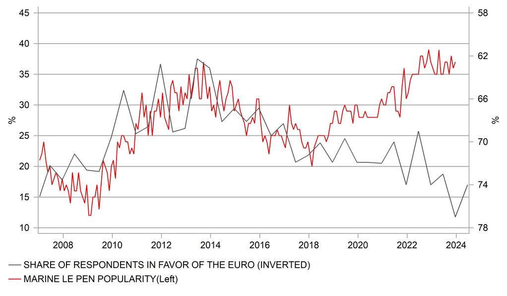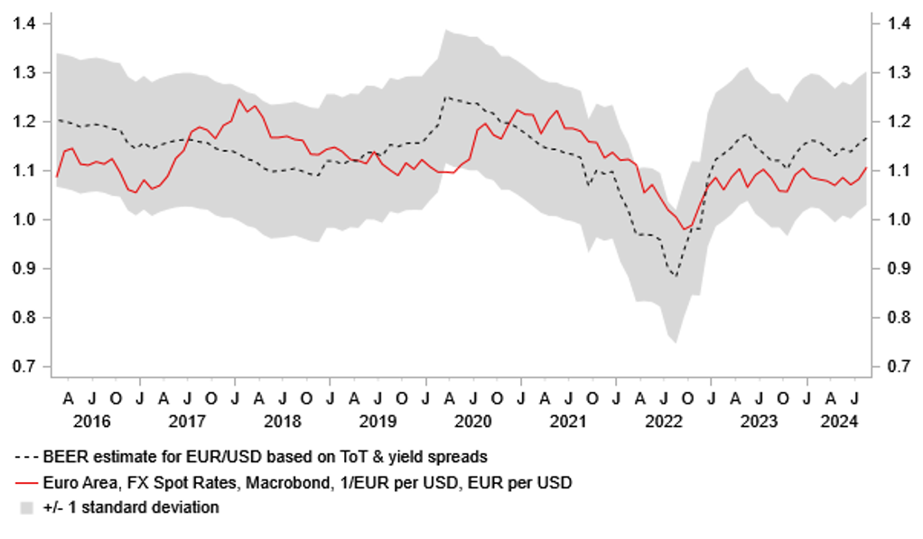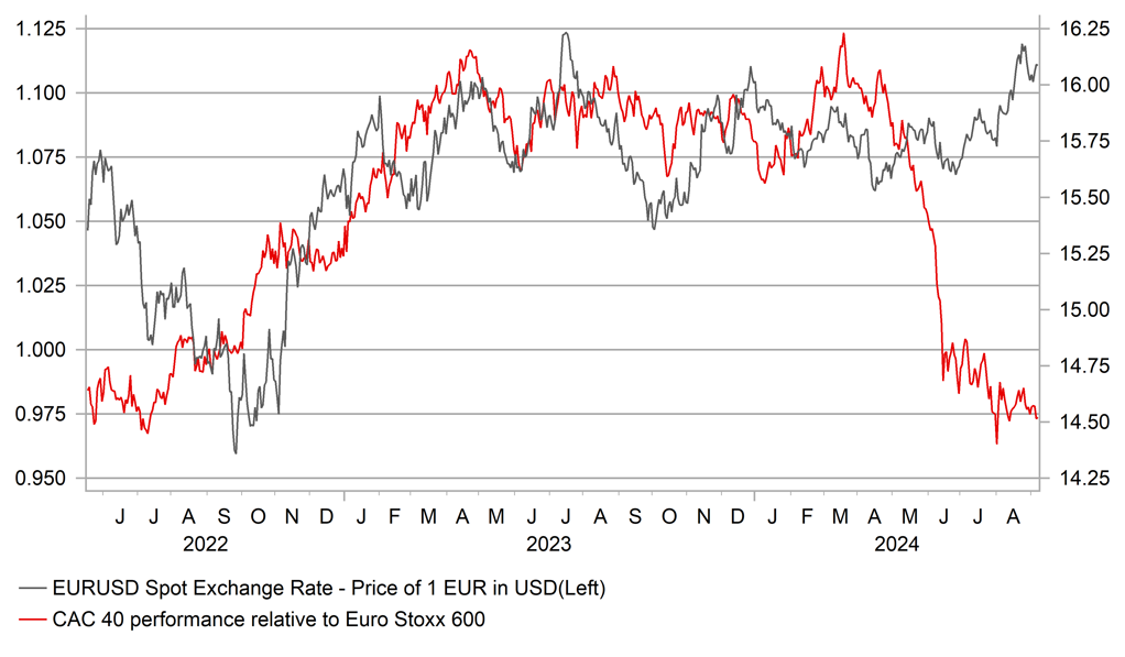The euro on a trade-weighted basis fell by 1% as the OAT/Bund spread widened out on Macron’s announcement of an election but the FX impact faded quickly and EUR EER has since advanced 1.5%. A successful no-confidence motion would likely spark some FX impact but we see this as unlikely for now. A more active Fed in cutting rates will be the more dominant impact, helping to support EUR over the coming months.