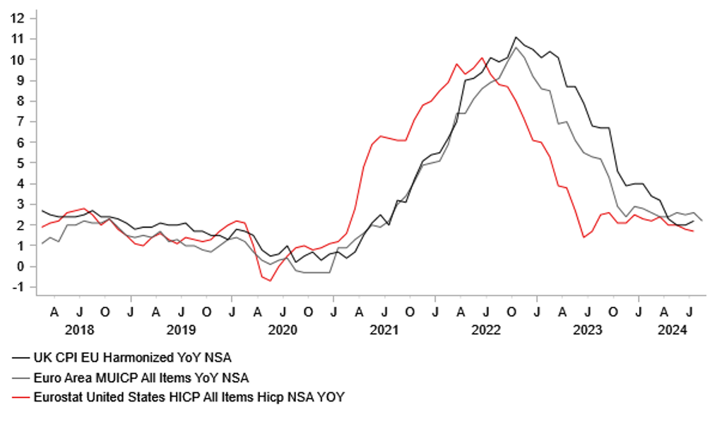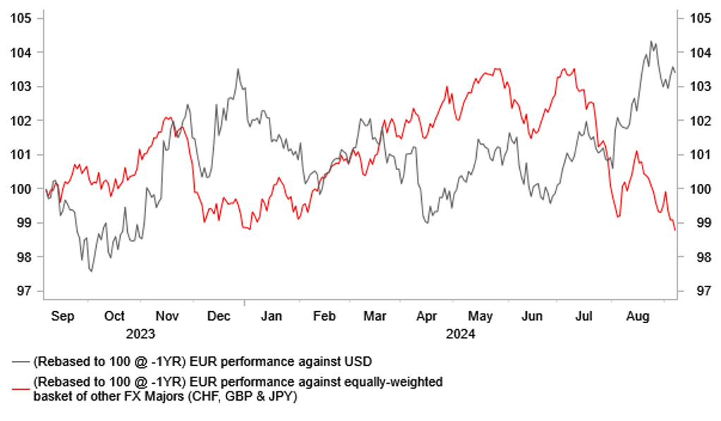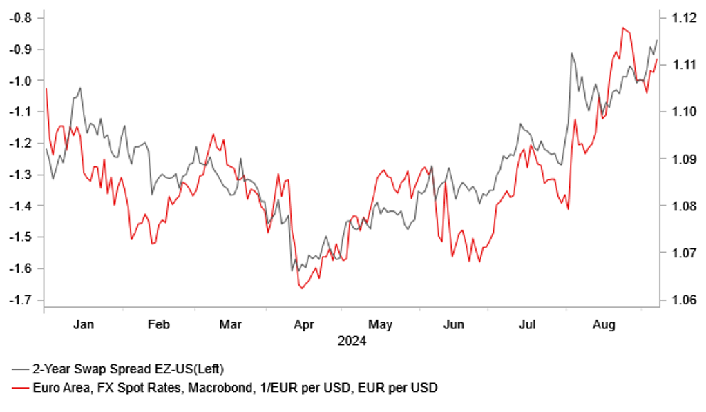 The main driver for the recent adjustment higher for EUR/USD has been building market expectations for more aggressive Fed easing as they plan to start cutting rates later this month. Yields in the US have fallen by more than in the euro-zone over the past month. The two-year US government bond yield has fallen by 28bps compared to only 13bps for the German equivalent. US rate market participants have become more confident that the Fed will play catch up with the ECB by cutting rates at all three remaining FOMC meetings this year by a cumulative total of around 111bps. It reflects expectations as well that at least one larger 50bps cut will be delivered to reflect the risk that the Fed feels it has fallen behind the curve. In contrast, the euro-zone rate market still expects the ECB to remain more cautious when lowering rates. There are only around 63bps of ECB rate cuts priced in by the end of this year.
