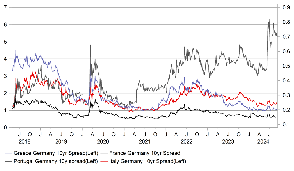 Where we do have specific dates when challenges could emerge is firstly on 20th September when France must present to the EU its proposals on bringing down its budget deficit under the Excessive Deficit Procedure that was triggered by the EU in June/July. This date could be extended to 15th October. The second date is 1st October when a budget plan must be presented to the national assembly. France’s budget deficit was 5.5% of GDP in 2023 and is forecast to remain at 5.0% in 2025, above the EU threshold of 3.0%. France’s government debt is projected to rise from 110.6% of GDP in 2023 to 113.8% in 2025, compared to a 60% EU limit. The proposed budget left by PM Attal keeps total spending in 2025 unchanged versus 2024. Under new EU rules, France will be obliged to reduce the deficit by 0.5% per year. The French Treasury estimates spending cuts of EUR 30bn will be required to meet EU requirements. Failure to do this can result in fines although that has never happened. The new EU Commission does not take office until 1st November so any rule breaches would not be formally addressed possibly until 2025. PM Barnier has strong EU links which will prove important in any negotiations with the EU over continued breaches under the Excessive Deficit Procedure.