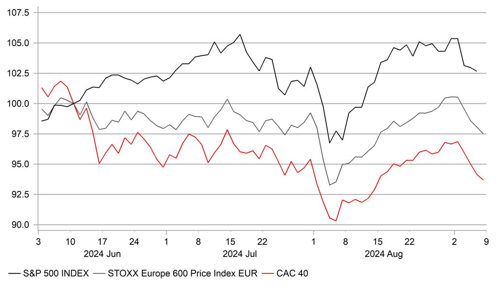 The decision of President Macron to name Michel Barnier as the new Prime Minister of France has been met with near complete indifference by the financial markets with EUR/USD being driven higher by declining yields in the US, and the OAT/Bund spread close to unchanged at marginally narrower levels. This might be explained by the fact that investors don’t have reason to expect any dramatic change in the political landscape in France – France remains in political gridlock and while we have had progress in the naming of a Prime Minister that at least for now looks acceptable for Marine Le Pen’s Rassemblement National (RN), Michel Barnier still has an immense task in breaking this gridlock. So it can be argued that the lack of financial market reaction reflects the scepticism of the new prime minister making much headway in policy implementation that would help improve investor sentiment. The CAC 40 is down 6.3% since the EU parliamentary elections in June compared to a 2.5% drop for the Euro Stoxx 600 and a 2.5% gain for the S&P 500. So what lies ahead now that France has a new prime minister and are there scenarios that could prompt some increased financial market volatility?