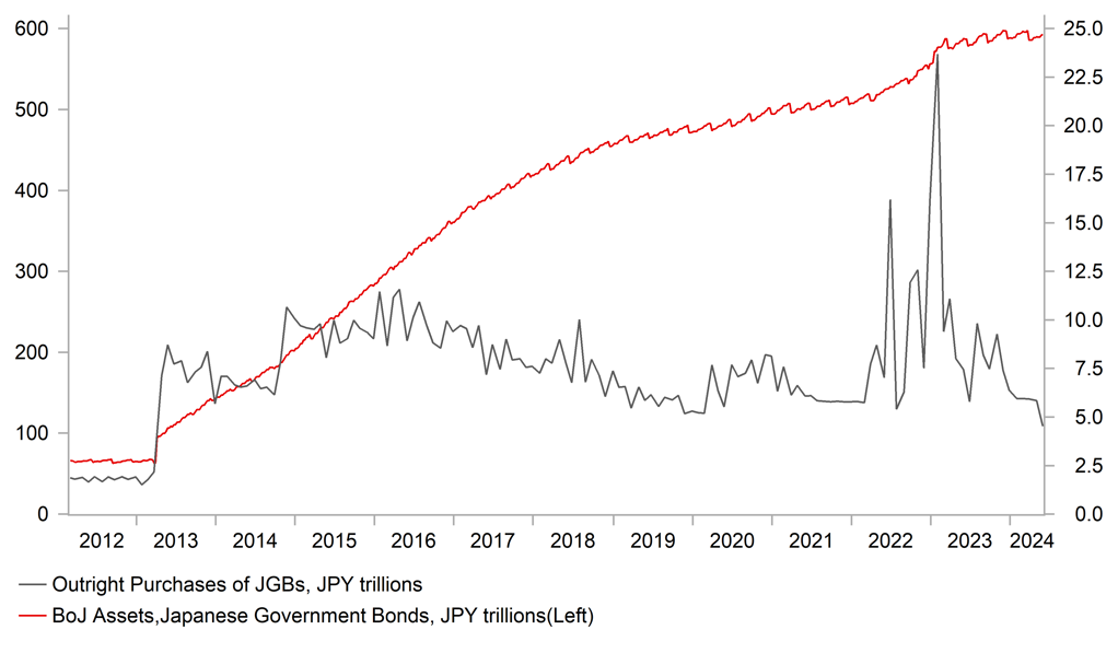 The comments from Adachi and the signs of increased confidence over achieving the virtuous circle between wages and prices means a change in JGB buying policy is likely next week. There appears a strong desire to focus on the continued smooth functioning of the JGB market and hence could simply indicate a very gradual slowing of purchases that will be dictated by maintaining a stable, smooth functioning and liquid JGB market without providing a numerical guide. That approach could however run into trouble if for other reasons volatility picks up and investors are unclear how the BoJ would respond. The alternative approach would be to provide a numerical framework and but given this lacks flexibility would have to be at such a moderate pace that it has limited impact. Our MUMSS Tokyo colleagues estimate a roll-off of JGBs from the BoJ’s balance sheet of JPY 67trn this fiscal year and JPY 74trn in FY25. The current pace of buying implies purchases of about JPY 70trn this fiscal year so there is space to slow purchases to an average of between JPY 5.5trn and JPY 5.0trn that would imply only a modest roll-off of total JGBs held, which currently totals JPY 597trn as of 31st May. Holdings have been stable at around this level since March 2023.