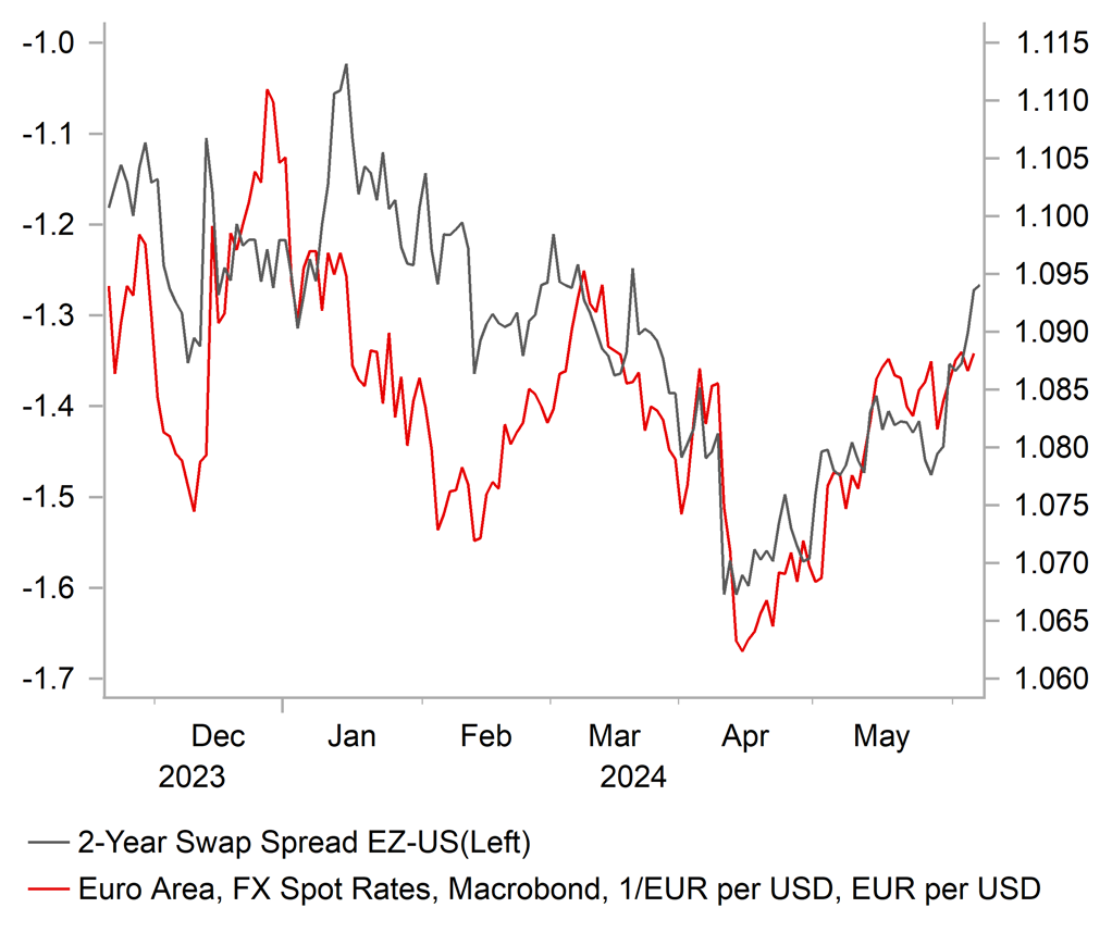 The other key events in the week ahead for EUR/USD performance will be from the US. The release of the latest US CPI report for May and FOMC meeting on Wednesday will both be important for driving the USD leg. Market participants are more wary of a hawkish policy update from the Fed next week after today’s strong US NFP report both for employment growth and wages. For the USD to continue trending weaker, it will require another softer US CPI report and for the Fed it signal that it remains confident inflation will slow back towards their target despite the lack of progress at the start of this year. We expect the Fed’s updated projections to show an upward revision to the inflation outlook for this year but not sufficient to prevent the Fed from continuing to signal that they plan to deliver multiple rate cuts in the 2H of this year. We expect the USD to weaken further if the Fed’s updated DOT plot reveals that the median forecast for the Fed funds rate at the end of this year has been raised by just 25bps to indicate plans to deliver 50bps of cuts this year. To trigger a bigger reversal of the recent USD weakening trend, the US CPI report for May and/or FOMC meeting would have to seriously cast doubt on whether the Fed will cut rates at all this year.