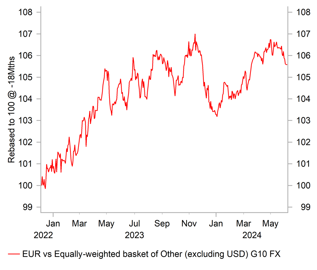 The EUR has derived some support this week from the ECB’s latest policy update. While the ECB started to cut rates as widely expected by 25bps to 3.75%, the updated forward guidance struck a relatively hawkish tone. As we highlighted in yesterday’s FX Focus report (click here), the ECB was non-committal over the future rate path and attempted to dampen talk that it was the start of a rate cut cycle. There was no strong signal over the timing of the next rate cut although they did push back against expectations for another cut as soon as the next policy meeting in July. The updated guidance alongside upward revisions to the ECB staff inflation forecasts for this year and next year have encouraged the euro-zone rate market to scale back expectations for ECB rate cuts through the rest of this year. There are now only 32bps of cuts priced in by year end indicating that our forecast for a third rate cut is now under greater scrutiny. With the next “live” ECB policy someway off in September, it gives the ECB plenty of time to assess the incoming economic data in the coming months.