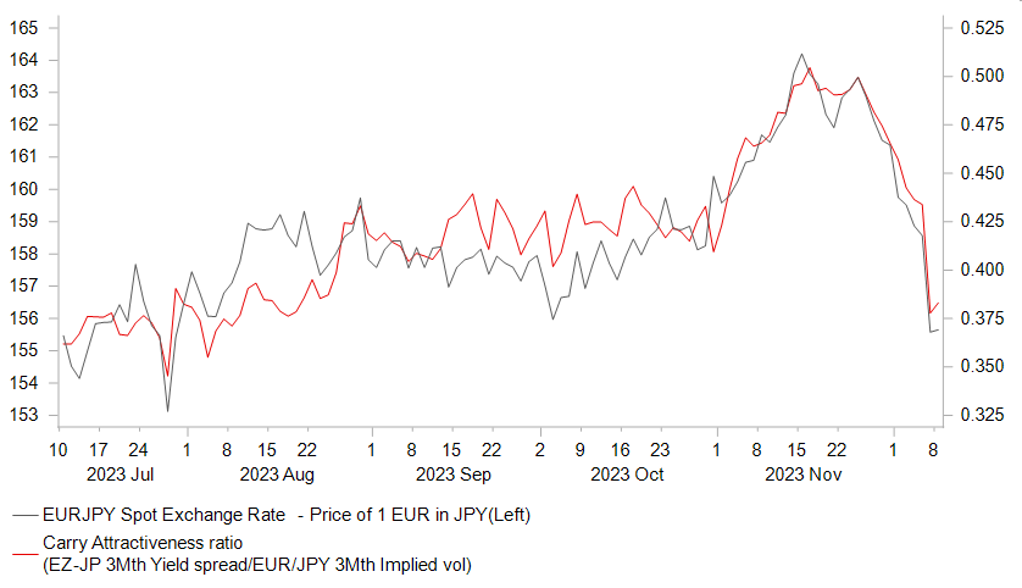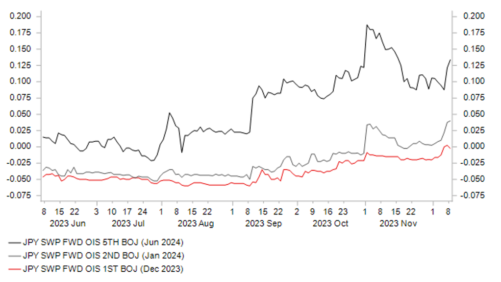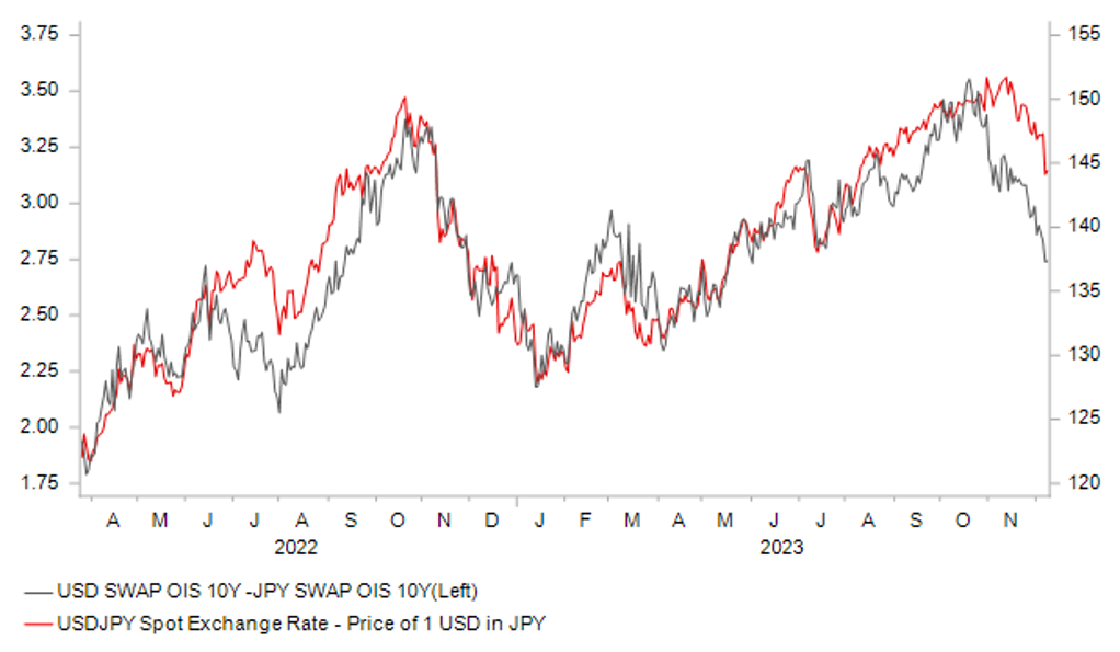 It is somewhat bizarre that this JPY move and increased speculation on a BoJ hike happened yesterday rather than on Wednesday. Governor Ueda’s comments yesterday were in fact much more balanced, even cautious on the view that inflation is becoming sustainable. He stated it was too early to conduct an exit simulation and that now was not the time to focus on exit. He also stated that the BoJ still did not see certainty in achieving the inflation goal. These comments in the Diet don’t appear to signal an imminent change and hence we maintain our view that the BoJ will end both YCC and NIRP at the January MPM.