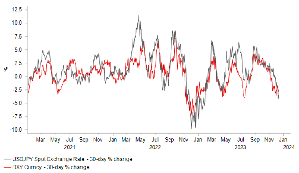 USD/JPY CHANGE NOW IN LINE WITH BROADER DXY MOVE