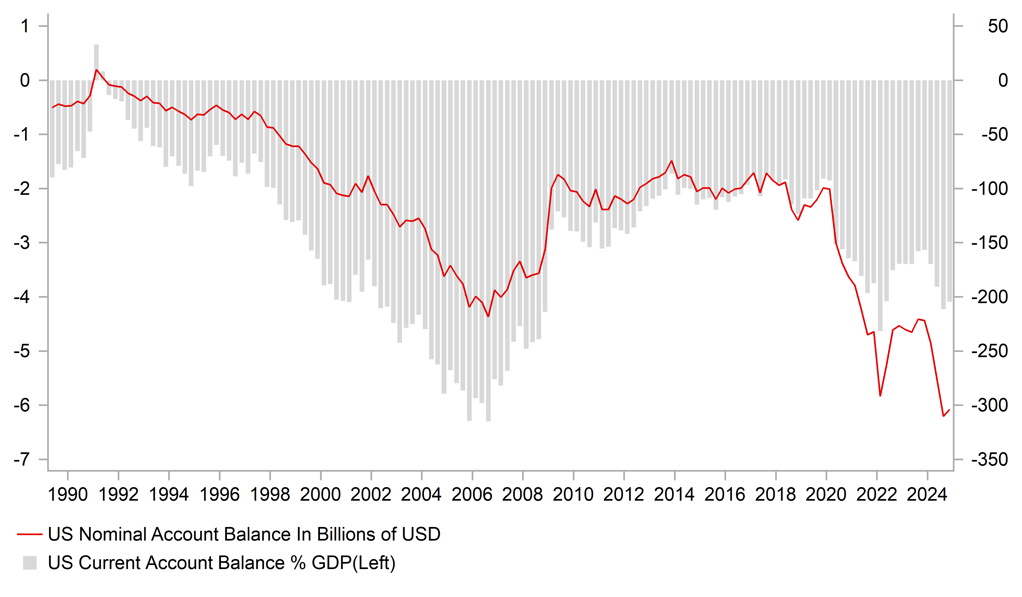 US CURRENT A/C DEFICIT $ TERMS & % GDP THE ISSUE THAT TRUMP WANTS TO ADDRESS WITH TARIFFS