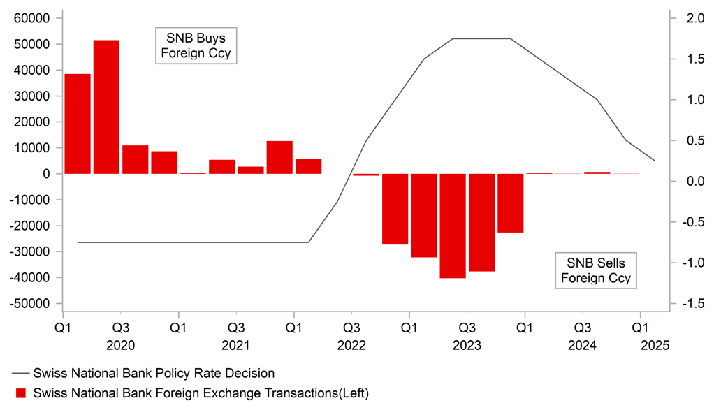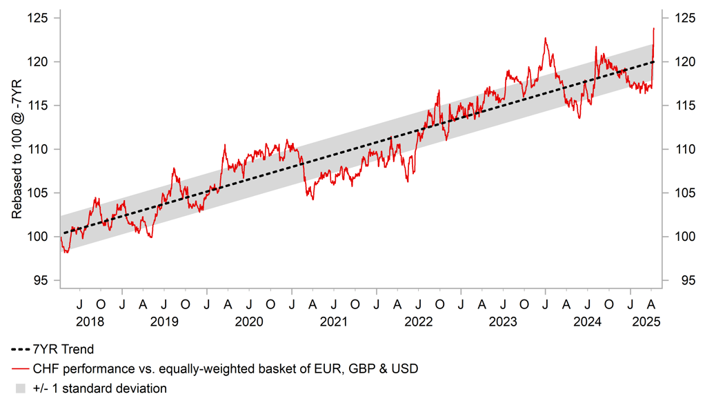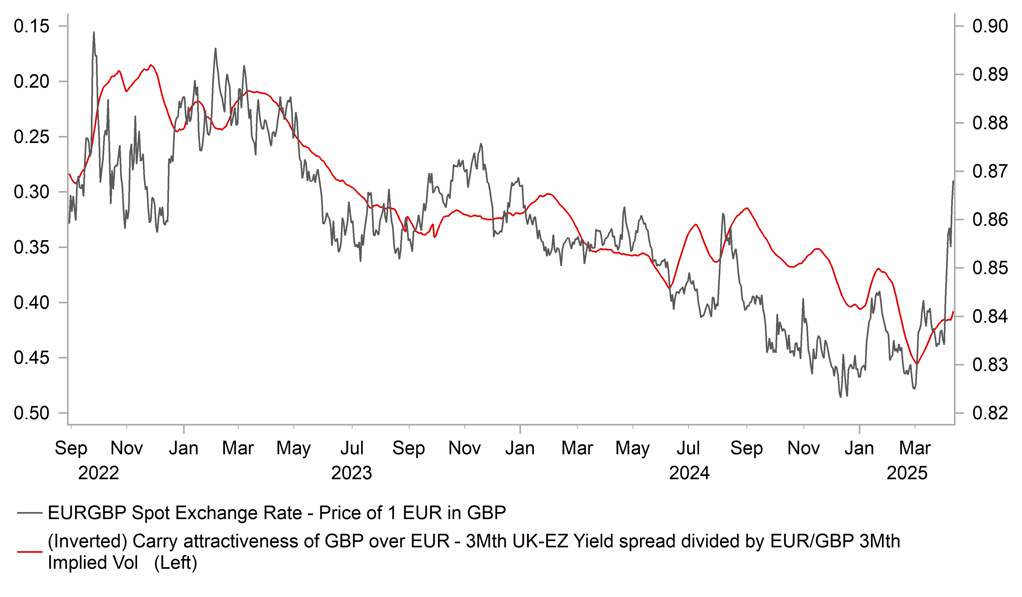 In contrast to the EUR and CHF, the GBP has underperformed this month alongside the other high beta G10 currencies (NOK, AUD & NZD). It has resulted in EUR/GBP rising sharply up to a high of 0.8738 which is the highest levels since the end of 2023. As a result the pair has reversed all of the move lower since the ECB started their more front-loaded rate cutting cycle in comparison to the BoE. Long GBP positions built up to capture the widening yield spread between the UK and euro-zone have squeezed recently by demand from the EUR on the back of the loss of confidence in the USD, and more volatile financial market conditions that hurts carry currencies such as the GBP. President Trump’s decision to temporarily apply a smaller 10% tariff to the EU matching the tariff on the UK was less important in justifying the sharp move higher in EUR/GBP. At the same time, long-term yields in the UK have more closely followed the move higher in US yields compared to those in the euro-zone. The 30-year Gilt yield hit a new high this week at 5.66% and has risen by around 40bps from recent lows. Similar to the US the UK runs a current account deficit (~2.5% of GDP) and relies on funding for overseas. The sell-off in Gilts as we’ve seen in the past following UK-specific fiscal events has coincided with temporary periods of GBP weakness and will add to downside risks to growth in the UK if higher yields are sustained. In these circumstances, the EUR and CHF should continue to outperform the GBP and USD until confidence begins to returns and/or SNB pushes back against CHF strength.