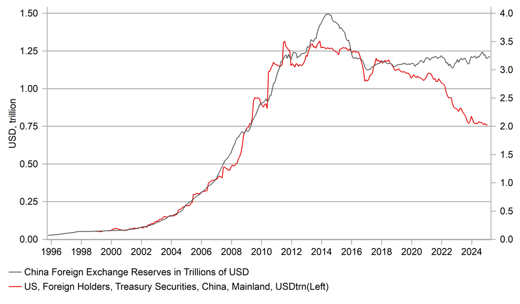 Data reliability is certainly an issue in terms of getting any near-term sense of what China is currently doing. When we discussed the risk of China selling its UST bond holdings we were always quite sceptical. However, we never assessed that risk against the backdrop of a 145% tariff rate! What we can see from the official TIC data is that China’s reported holdings have declined notably despite reported China FX reserves remaining roughly stable. Long-term UST bond holdings have declined from USD 1,040bn at the end of 2021 to USD 761bn as of January. In 2022 and 2023 China increased purchases of US Agency debt, but by much less than the UST bond selling, by USD 68bn but in 2024 nearly all of that increase was reversed. China is likely using other entities/countries to buy US assets so it remains unclear to what extent UST bond holdings have been reduced. Still, all it would take in current market conditions would be for China to hint at action to likely trigger another wave of volatility and selling.