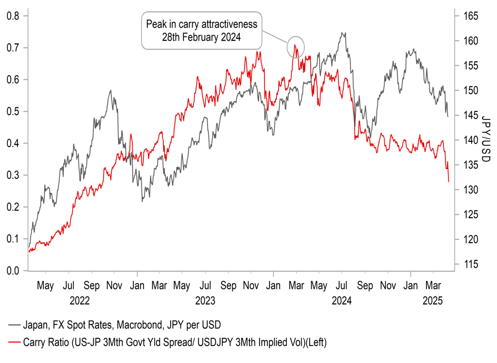 If confidence in the UST bond market remains fragile, there really are only two alternatives to take capital flows – the euro-zone and Japan bond markets. Japan for the first time in a long time now also has the added advantage of a more attractive yield. But yield doesn’t necessarily matter either with capital protection key, which is evident in CHF being the top G10 FX performer. We see no reason to doubt the continuation of core G10 being where investors express their shift away from the US. The scale of dollar selling in core G10 is helping drag non-core, high-beta G10 stronger too. But we remain sceptical of the likes of AUD, NZD, NOK and SEK performing strongly and expect higher volatility and sharp swings back and forth. Until we see some form of policy shift from Washington, the dangers are high that we see confidence deteriorate further. UST bond yields are on the rise again and in this market we position for CHF, JPY and EUR to continue outperforming. Our Price Action Analysis further below highlights that periods of triple asset selling (bonds, equities and FX) to the extent we have had this week tends to signal further US dollar depreciation over a two and three-month period.