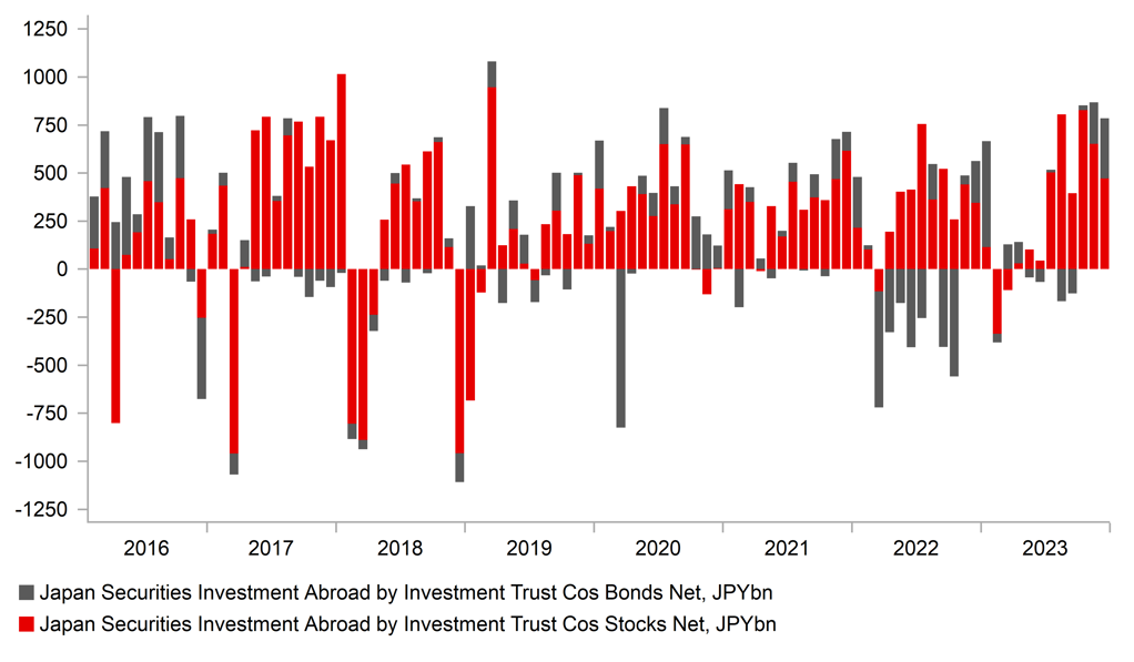 From the start of 2024, the Nippon Individual Savings Accounts (NISAs) rules have been overhauled as the government attempt to entice Japanese households out of holding so much of their wealth in cash and deposits. The annual tax exemption is being raised from JPY 1.6mn per year to JPY 3.6mn and this can be utilised over a 5yr period amounting to JPY 18mn. Investment Trusts (Toushins) is where this flow into foreign markets can be monitored in monthly MoF flow data. The composition that goes abroad based on Toushin data is around 30%. The government’s target is to see this NISA fund double over the next five years from JPY 28trn to JPY 56trn. The change in dollars over 5yrs equates to USD 193bn. Assuming a 30% shift abroad we calculate roughly a flow per month of about USD 1bn. This is not ground-breaking of course but that figure is based on a linear line over 5yrs. There is highly likely to be a front-loading element to this and with the new changes now live, we may see some bigger FX impact in the early part of the year. We will monitor Toushin flows with the January data from the MoF due around 8th -10th of February.
