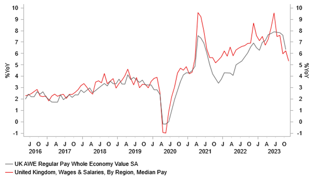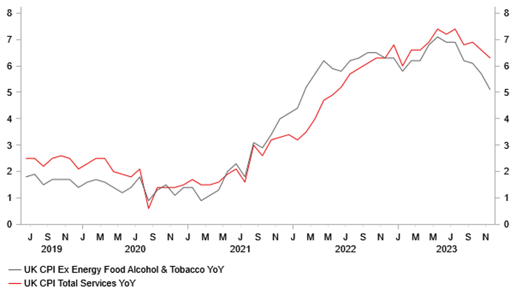 The BoE is still expected to lag behind both the Fed and ECB when cutting rates in the year ahead. The first 25bps cut from the BoE is not fully priced until 20th June MPC meeting. In comparison the first 25bps rate cuts from the Fed and ECB and fully priced in by their 1st May and 11th April policy meetings respectively. For this year as a whole, the UK rate market is roughly pricing in around 25bps less of cuts than in the euro-zone and US. The divergence continues to reflect investor concerns that there is a higher risk of inflation proving more persistent in the UK. Those concerns were eased somewhat by reassuring evidence of slowing inflation and wage growth at the end of last year which contributed to GBP underperformance in December. In the week ahead, the release of the latest UK CPI (Wed) and labour market (Tues) reports will be scrutinized even more closely to better assess whether the disinflationary developments evident in December will be sustained. Inflation is running well below the BoE’s own forecast from the November QIR in which they forecast headline and core inflation ending last year at around 4.6% and 5.6% respectively. We expect significant downward revisions to the BoE’s inflation forecasts in February.