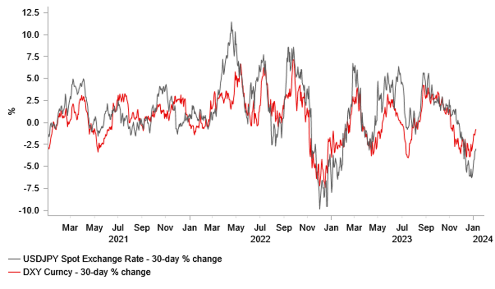 The USD has staged a modest rebound at the start of the new calendar year following the heavy sell-off at the end of last year. The USD has derived support from the releases of the stronger NFP and CPI reports for December that failed to reinforce market expectations for Fed rate cuts as soon as in March. On the other hand they were not strong enough either to trigger a significantly hawkish repricing in the US rate market. US inflation has still clearly slowed in 2H of last year. The biggest mover amongst G10 currencies at the start of this year has been the JPY. Renewed JPY selling has been encouraged by expectations that the BoJ will delay their exit from negative rates until at least April. While at the same time, expectations for earlier rate cuts from the fed and other major central banks have been scaled back resulting in a re-widening in policy divergence with the BoJ. BoE rate cut expectations will be mainly tested in the week by the release of the latest UK CPI and labour market reports. Further evidence of disinflation would weaken the GBP.
