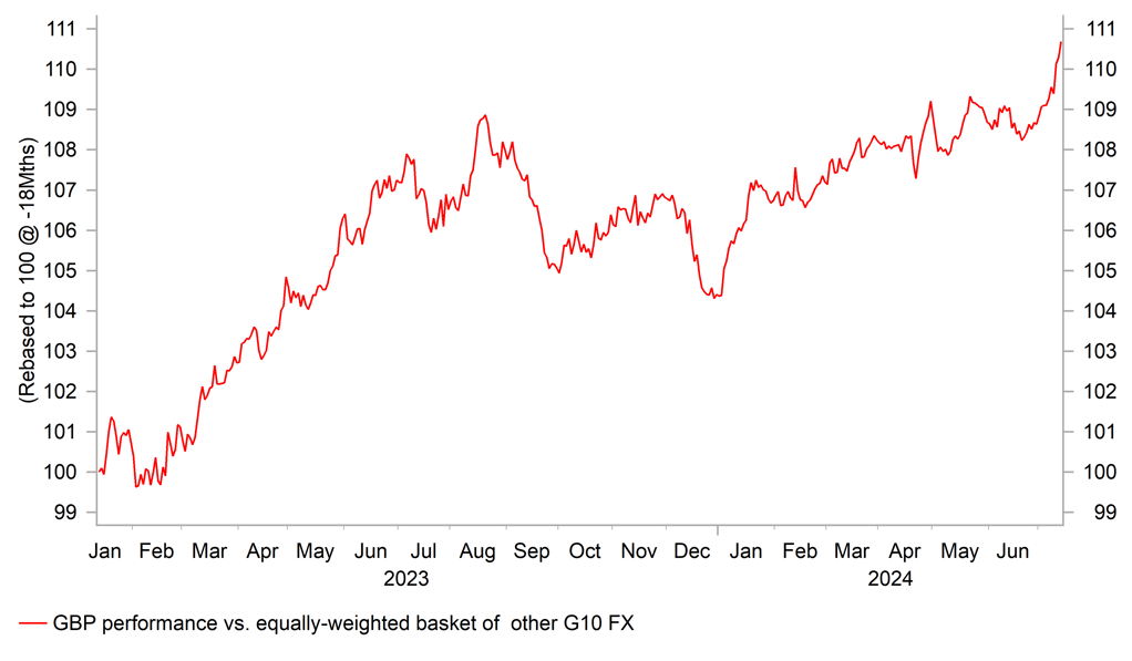 The USD’s recent weakening trend has continued over the past week. Fed Chair Powell was clear this week in his semi-annual testimony on monetary policy that he wants to see more “good data” before becoming confident enough to begin cutting rates. The release of the US CPI report for June has since provided the most compelling evidence yet that inflation continues to slow, and has encouraged US rate market participants to price back in a more aggressive path for Fed rate cuts in the year ahead. At this month’s FOMC meeting the Fed could provide stronger guidance that they are moving closer to cutting rates in September. The USD has been following US yields lower with a lag which we expect to continue heading into the summer. In contrast, the GBP continues to outperform supported by improving cyclical momentum of the UK economy. The releases of the latest UK CPI and labour market reports in the week ahead will be important in determining whether the BoE begins to cut rates next month or delays until later this year.