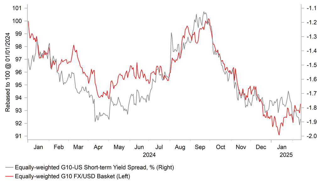 There was a high level of conviction at the start of this year that the USD would strengthen further as evident in crowded long positioning that had reached the highest levels since 2018. However, those expectations have not yet materialized in reality with the USD on course for its fourth week of losses out of the last five. USD selling has continued this week despite President Trump outlining plans to impose 25% tariffs on steel and aluminium and “reciprocal tariffs” on a country-by-country basis. The tariffs will not be imposed until March and April which has added to the initial sense of relief that Trump’s tariffs won’t be as disruptive for global trade and growth as initially feared. However, the initial sense of optimism could still prove to be misplaced. There is a higher risk now that the reciprocal tariffs will be implemented widely and be more disruptive. Alongside the Fed keeping rates higher for longer, it is still premature to abandon our call for a stronger USD even if it may take a little longer to materialize.
