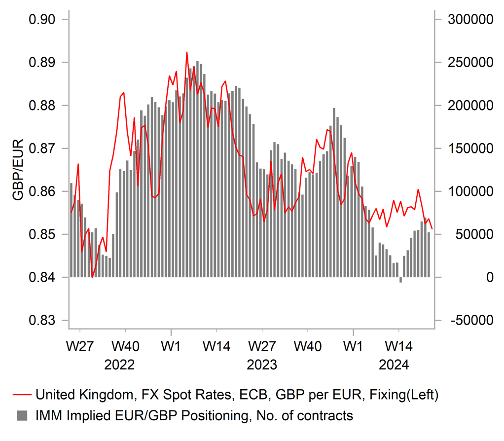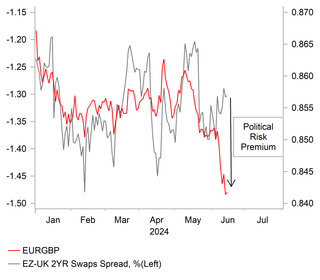 The bearish break out for EUR/GBP over the past week has been driven mainly by political developments in Europe. French President Macron’s decision to hold snap parliament elections on 30th June and 7th July has encouraged a weaker EUR as market participants move to price in a higher political risk premium (click here). Heightened fiscal concerns is one area that is attracting more market attention and has already resulted in the yield spread between French and German 10-year government bonds widening sharply to the highest level since in early 2017. Yesterday’s announcement that the left-leaning political parties (the Greens, Socialists, and France Unbowed) in France have sealed a formal alliance have added to those concerns. In contrast, the upcoming general election in the UK which is scheduled to take place on 4th July has had limited impact on GBP performance so far. Market participants remain comfortable with the prospect of the Labour party winning a strong majority in parliament. The release yesterday of the Labour party’s official manifesto (click here) contained no major policy surprises as it outlined relatively modest tax and spend plans. As we highlighted in our UK election preview (click here), a strong Labour majority could even be viewed as supportive for the GBP by welcoming in a period of greater political stability in the UK and opening the door for closer relations with the EU.