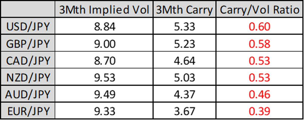 The GBP continues to derive support as well from the ongoing improvement in global investor risk sentiment at the start of this year alongside the higher yields on offer in the UK. The recent liquidation of FX carry trades in emerging markets triggered by the election results in South Africa, Mexico and India has had limited spill-over impact for G10 FX carry trades. After the USD, the GBP remains the second most attractive G10 currency carry currency within the G10 after adjusting for currency volatility as well. Please see the table below for G10 FX carry/vol ratios for G10 FX/JPY pairs.