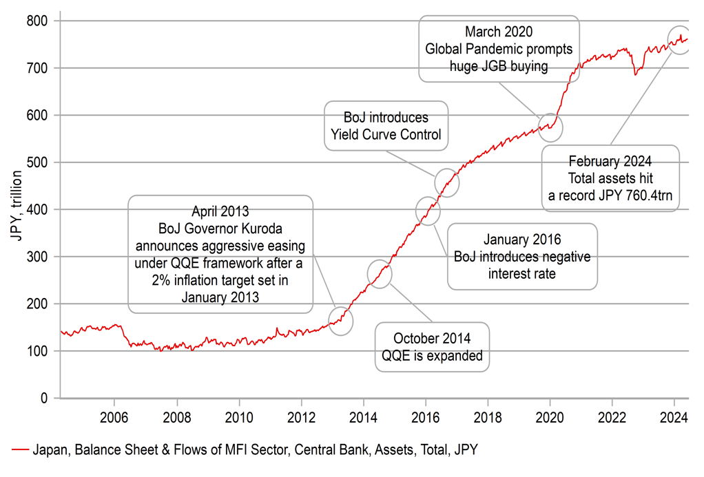 BOJ’S BALANCE SHEET 4.5 TIMES LARGER SINCE 2013 EXPANSION BEGAN, NOW EQUATING TO 125% OF GDP
