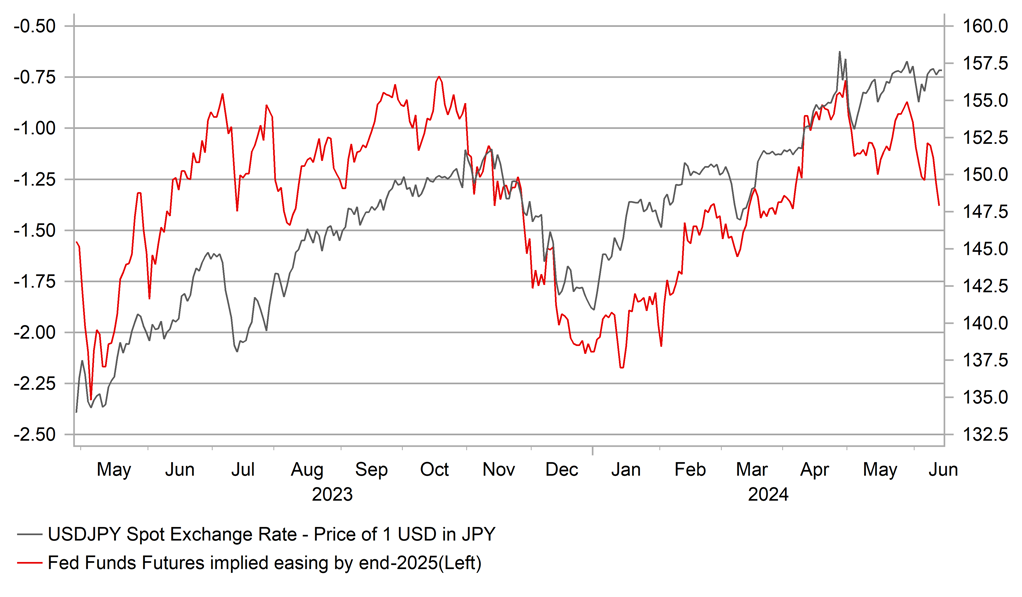 But we would also argue that all-else is not equal and external factors do look to be providing the yen with support. Firstly, the interpretation of the FOMC meeting may be mixed but the reality in the rates market is that the fed funds futures implied yield shows rate cut expectations this week have jumped 30bps in the period to end- 2025. That will limit the upside for USD/JPY. Secondly the dollar is likely to continue performing well versus EUR as the political risk premium grows into the French elections. Our quants section below highlights the rebound in the correlation between JPY and CHF that may be an early sign of the yen’s safe-haven status reviving. The French elections may reinforce this given there has been considerable carry positioning in yen crosses, like EUR/JPY, that may see further position liquidation into the French elections.
