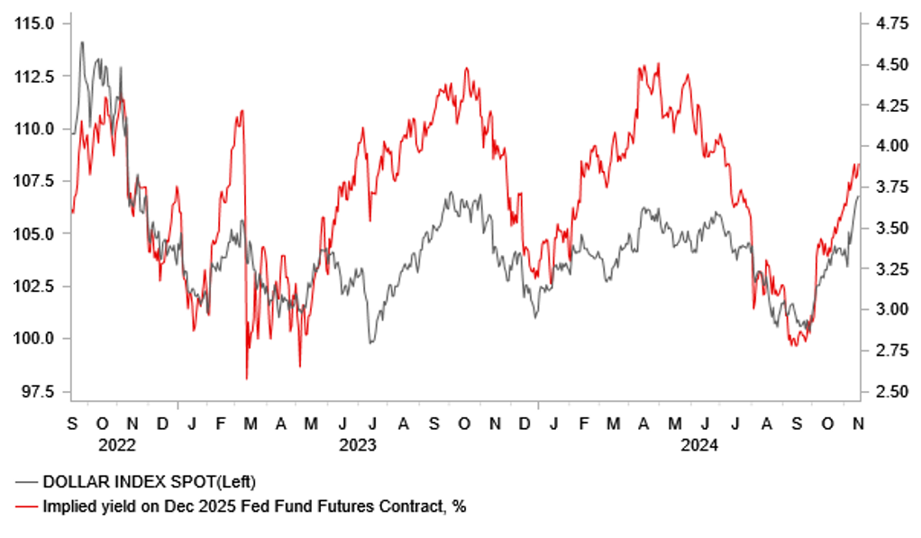 The USD has continued to strengthen sharply over the past week after last week’s US election. It has resulted in the dollar index rising up towards technical resistance provided by the highs from autumn of last year at just above the 107.00-level. The dollar index has now risen by almost 7% since late in September as market participants have moved to price in the recent run of stronger US economic data releases including activity and inflation alongside building expectations for the incoming Trump administration to put in place inflationary policies (import tariffs & tougher immigration rules) in the year ahead. The release of the latest US CPI and PPI reports for October have indicated that inflation firmed for the second consecutive month. The core PCE deflator is likely to come in above the Fed’s forecast of 2.6% for the end of this year that was set back at the September FOMC meeting. The stronger run of US data has already prompt the Fed to slow down the pace of easing by delivering a smaller 25bps rate cut this month, and Fed Chair Powell signalled yesterday that it was not a done deal that they will deliver another 25bps cut as planned next month. Fed rate cut expectations have been scaled back significantly with the implied yield on the December 2025 Fed fund futures contract rising by around 110bps since the low in September. As a result, market expectations for the terminal rate in the Fed’s current easing cycle has been lifted up to just below 4.00% which is well above the Fed’s estimate of the neutral rate at just below 3.00%.