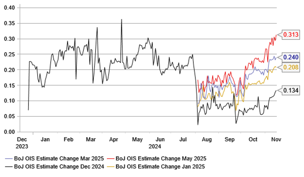 We believe we are in the ‘danger-zone’ for intervention to take place – between 155.00 and 160.00. In this area ahead of a new Trump presidency, the MoF will likely act if we see further moves higher toward the 160-level. We also expect the BoJ to play its part in providing support for the yen with a message from Governor Ueda that yen depreciation could expedite the need for a rate hike sooner than expected.