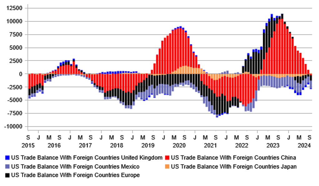 Politico reported earlier this year that Robert Lighthizer and other close economic advisors to Donald Trump were also actively debating ways to devalue the USD if he wins a second term as president. According to the report, Robert Lighthizer was considering ways to weaken the USD unilaterally or through negotiations with foreign nations using the threat of tariffs. Something which is viewed as more likely to be pursued by Donald Trump is he is chosen as the new Treasury Secretary. Lighthizer’s ideal situation as outlined in his 2023 book, is to try to strike a grand bargain with foreign governments on currency, similar to the Plaza Accords stuck in 1985 to weaken the USD relative to the JPY and European currencies. When the Plaza Accords were negotiated in the 1980’s, the implicit threat of tariffs from the US government helped to push foreign governments to adjust the value of their currencies. With China and European economies currently struggling with weak domestic demand, it is hard to see major trading partners agreeing to strengthen their currencies. Similarly, the likes of China and Germany have been reluctant to boost demand/consumption through loosening fiscal policy. Furthermore the incoming Trump administration plans to maintain loose fiscal policy in the US unlike the agreement reached to tighten US fiscal policy as part of the 1985 Plaza Accord Agreement. Overall we continue to believe it will be difficult for Donald Trump to weaken the USD if he implements his policy agenda. The imposition of retaliatory tariffs on US imports by foreign nations, and slowing US growth in response to higher inflation could though help to dampen USD strength.