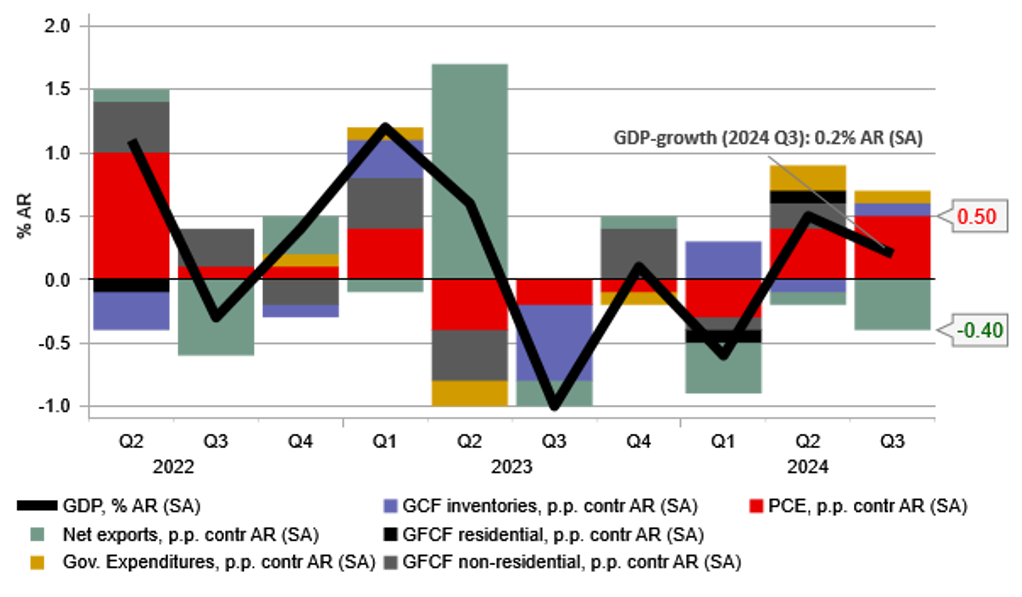 Real GDP data for Q3 released today was slightly stronger than expected but confirmed a slowdown with growth of 0.9% Q/Q SAAR, down from 2.2% in Q2. The consensus was for growth of 0.7%. The composition of the GDP growth was more positive with household consumption expanding by a non-annualised 0.9%, up from 0.7% in Q2. The main area of weakness was in external demand which shaved 0.4ppts from overall GDP growth. Growth likely would have been stronger were it not for a big drop in industrial production that was in part impacted by a typhoon and a mega-quake warning by the government. Overall the GDP data provided some good news on the consumer side of the economy but was also mixed enough to ensure the government continues with plans for a substantial fiscal support package as had been promised by PM Ishiba ahead of the general election in October. This has taken on greater urgency perhaps given the victory for Trump in the election and given the weakness in external demand evident in the Q3 GDP data. External demand conditions could be challenging in 2025 and hence boosting domestic demand will be key for the government.
