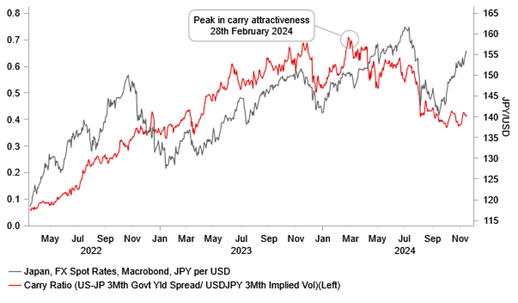 In our recently published FX forecast update (here) in light of Donald Trump’s election victory we revealed across the board stronger dollar forecasts including USD/JPY which in 2025 is now estimated to be 4-6 big figures higher than our previous forecasts. The change in forecast for year-end 2024 is more modest (152 vs 150) in part given the scale of rebound we had in USD/JPY prior to Trump’s election victory and given the increasing prospect of a rate hike from the BoJ and given the high chance of FX intervention to limit the extent of yen depreciation. We do accept though that the risks to our new year-end USD/JPY forecast is to the upside.