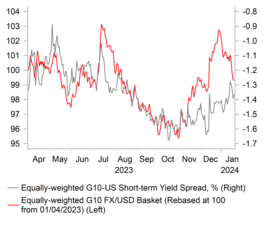 There have been two fundamental drivers for the USD’s rebound at the start of this year. The first reason is that market participants’ have started to question just how quickly the Fed is likely to start cutting rates this year and then the pace of cuts once the easing cycle is underway. The March FOMC meeting is now judged as closer to a 50:50 call for the timing of the first Fed rate cut whereas it was judged as more of a done deal at the end of last year. The amount of expected Fed cuts by the end of this year has also been scaled back from around -160bps to closer to -140bps. The hawkish repricing of the Fed policy outlook at the start of this year has been encouraged both by comments this week from Fed Governor Waller and evidence that the US economy is continuing to prove resilient to higher rates.