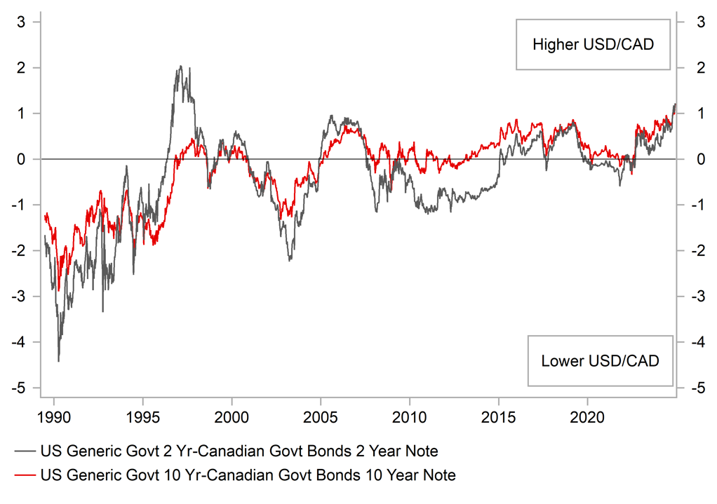 In contrast, the Fed has only lowered rates by 100bps since September and just delivered a hawkish policy update revealing plans for only two further 25bps cuts next year. We expect the Fed to pause rates in January and there is an increasing likelihood of a more extended pause if Trump’s initial policy focus lifts inflation risks at the start of next year. The BoC and Fed are both likely to face tighter labour supply conditions in the coming years as both Canada and US tighten immigration. The Canadian government plans to allow significantly lower new permanent residents to 395k in 2025 down from this year’s pan of 500k and to lower temporary residents by around 30k to 300k. As a result, the government expects the population to decline marginally by -0.2% in 2025. Slower labour force growth will argue for more caution in continuing to cut rates next year. The main downside risk that could still trigger deeper BoC cuts would be if higher tariffs are imposed on Canada but that is not our base case scenario. We are currently assuming that Canada will tighten border controls sufficiently to prevent tariffs being implemented but trade policy uncertainty will continue to linger ahead of the scheduled review of the USMCA trade deal on 1st July 2026.