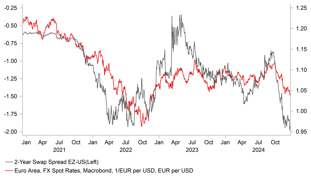 If the US economy does prove resilient over the coming months, the theme of US divergence versus the rest of the world will likely persist. This is clear to see versus the euro-zone. The 2-year EZ-US swap spread on Wednesday plunged to a new low of -198bps, surpassing the lows recorded during the post-Ukraine invasion period in 2022 when energy prices in Europe surged. That was when EUR/USD was trading well below the parity level and hence highlights where the risks lie over the coming months. A breach of parity in Q1 remains very plausible. The UK-US swap spread level is less compelling in pointing to GBP/USD declines but yesterday’s BoE meeting indicated a greater willingness to cut the policy rate with a close vote of 6-3 to remain on hold. We covered the BoE announcement yesterday in an FX Focus piece (here).