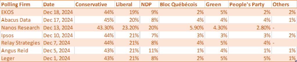LATEST POLITICAL OPINION POLLS FROM CANADA