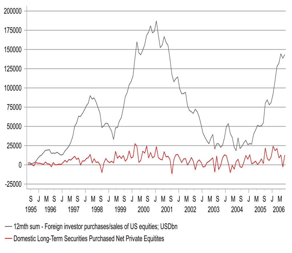 The 2001 example was not as successful as 1995 in achieving a soft landing as the economy contracted in both Q1 and Q3 2001 with annual GDP growth in Q4 2001 a mere 0.2%. The National Bureau of Economic Research that calls official recessions marked the recession from April to November 2001. But it was mild and was brought to an end ironically by 9/11 with then President George Bush implementing tax cuts to provide support for the US consumer. The Fed cut aggressively and by 50bps on the first five occasions with the fed funds falling from 6.00% to 1.75% by year-end. The economy was also suffering due to IT bubble bursting the previous year. The dollar advanced by 7% in the first 3mths and maintained that gain over 6mths. The ECB was much more conservative, cutting by 175bps between April and November. Despite the IT bubble bursting, the US dollar was supported by at that point record foreign investor demand for US securities in 2000 and 2001 through to 9/11. There was also USD buying intervention versus the yen after 9/11 by the Japanese authorities.