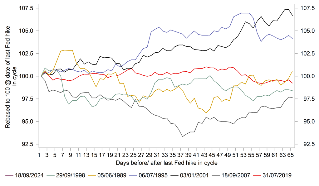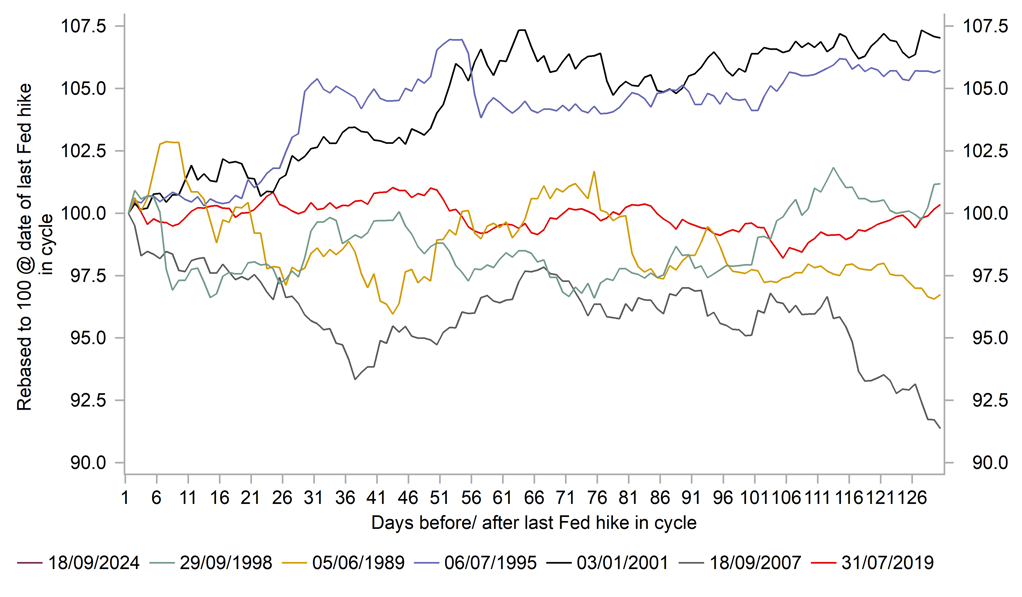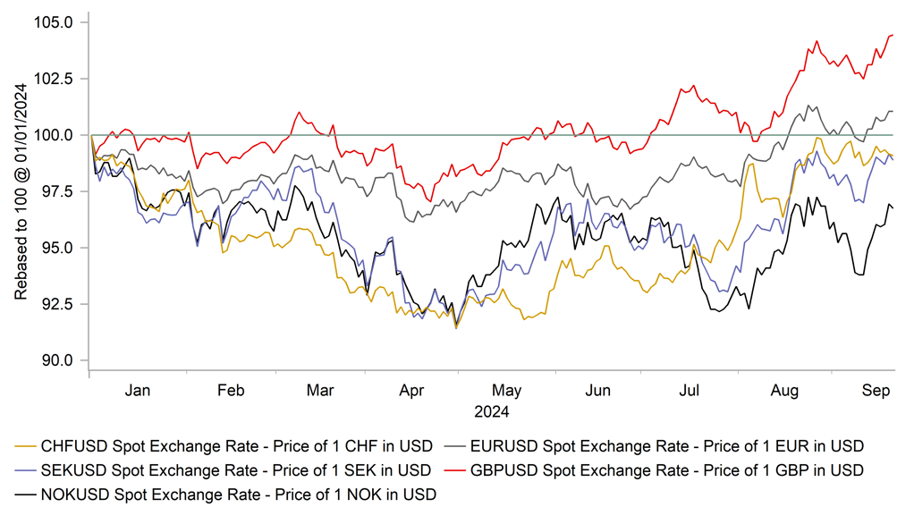 This week the US dollar (DXY) is lower by only 0.4% following the FOMC decision to cut rates by 50bps. It’s clear market participants were well positioned for the larger cut and that has seen a more muted reaction. After this first rate cut we take a look back at more recent Fed easing cycles to assess the response of the USD to the start of easing cycles. Of course every cycle is different but whether a soft or hard landing materialises is one key factor for performance. We also take a look at FX responses to central bank action in Europe in this cycle. So far, the FX impact has been mixed. The GBP’s outperformance has been encouraged by the BoE’s reluctance to lower rates but the Norges Bank’s similar stance has proven less supportive for the NOK. On the other hand, the CHF and SEK have strengthened even as the SNB and Riksbank have led the way in cutting rates. The SNB would have to deliver a larger 50bps cut in the week ahead if they want to even temporarily weaken the CHF and ease downside risks to inflation in Switzerland.