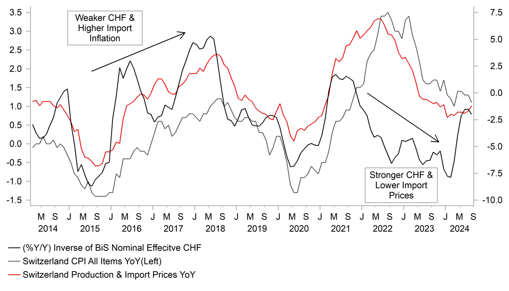 The next European central banks to provide policy updates in the week ahead will be the Riksbank (Wed) and SNB (Thurs). Both central banks are expected to continue lowering interest rates after starting to cut rates ahead of other G10 central banks back in March and May respectively. The SNB’s and Riksbank’s rate cutting cycles have not prevented the CHF and SEK from strengthening. The CHF strengthened sharply into early August resulting EUR/CHF hitting a low of 0.9211 on 5th August amidst market turbulence over the summer. It has since given back some of those gains as global investor risk sentient has improved. The stronger CHF and another downside inflation surprise in Switzerland (headline & core both at 1.1%Y/Y in August) will keep pressure on the SNB to follow the ECB and cut rates again in the week ahead. The SNB would have to deliver a larger 50bps cut if they want to at least temporarily weaken the CHF.