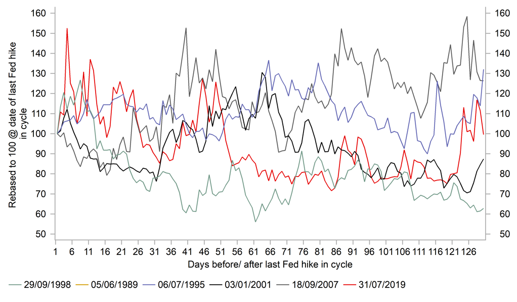The two charts below show the performance of the Fed’s Advanced Economy USD Index over a 3mth and 6mth periods following the first rate cut in the last six Fed easing cycles. We have included 1998 although this “cycle” was extremely short if it can be classed as a cycle at all and was really more about implementing rapidly some monetary stimulus to curtail the contagion from the Asian financial crisis that had spread triggering a Russian debt default and rouble devaluation. In any case, the performance of the dollar following the first rate cut is mixed – in both the 3mth and 6mth periods, the dollar is stronger on two occasions, close to unchanged to two occasions and weaker on two occasions.