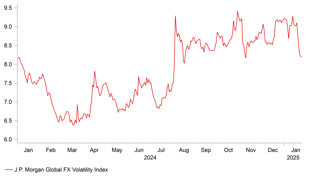 The US dollar has weakened this week in response to the reduced fears over the aggressiveness of President Trump’s tariff plans. There was no wave of tariffs announced on day one after inauguration and overnight Trump stated that he would “rather not have to use” tariffs against China. The threat of a 10% tariff on China and a 25% tariff on Canada and Mexico remains however and next week will be crucial in providing clarity on Trump’s approach to tariffs. We remain convinced that tariffs will be used actively by Trump and by the end of next week the financial market interpretation of tariffs could well be notably different. By then we may well be facing the imminent implementation of tariffs on 1st February. So we are unconvinced that this leg lower for the US dollar will be sustained and view this as just a lightening of a crowded long dollar position. The FOMC also seem most likely next week to signal continued caution on cutting rates given the resilience in the economic activity data.